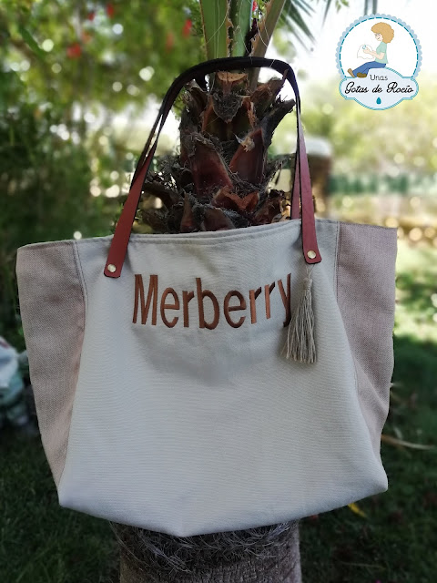 En base a un bolso de su gusto cogimos tamaño y mejoramos algunas medidas. Elegimos cierre magnético, tamaño del texto bordado, posición y longitud de las asas. Esto fue rápido, el resto no tanto. El colorido fue la primera gran decisión. Nos gustaban dos opciones: "modelo lavanda" con tela verde y texto morado, y "modelo capote" con tela amarilla y texto fucsia (¿o era al revés?). Finalmente Merberry optó por un colorido más neutro (arena y mellow rose). Pero esta opción hubo que descartarla ante la dificultad de encontrar las telas en el tono adecuado. Así que nos quedamos con los tonos tierra. Con la misma intensidad elegimos asas (de cuero, pero que no llevaran herrajes), color del bordado, fuente para el bordado y tipo de telas. Y es así que finalmente os puedo enseñar el bolso Merberry.